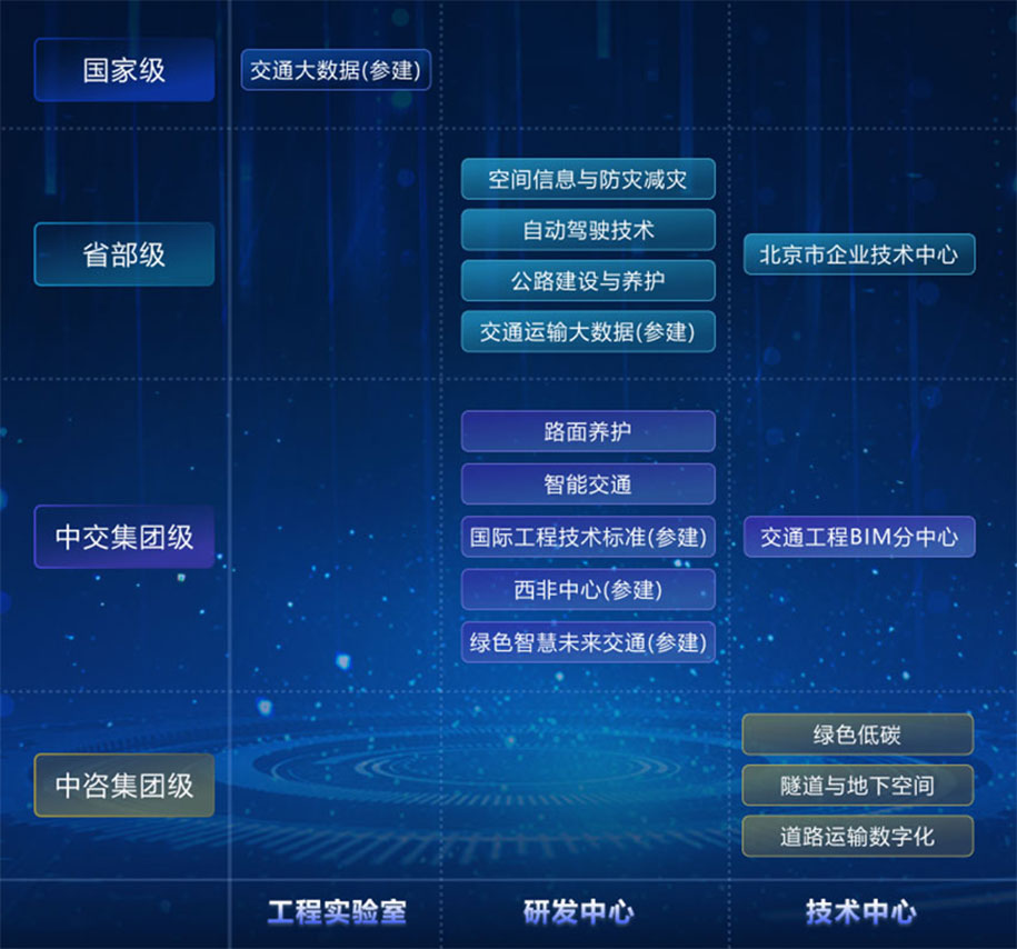 中咨集團一直秉承“追求卓越、敢為人先”的創(chuàng)新精神,深入實施創(chuàng)新驅(qū)動發(fā)展戰(zhàn)略,積極開展交通強國試點任務、科改示范行動。承建了空間信息應用、智能交通、智慧養(yǎng)護方向的交通運輸部行業(yè)研發(fā)中心,6個中交集團研發(fā)中心,自主成立3個中咨級專業(yè)技術(shù)中心,打造“四級三類”科技創(chuàng)新平臺體系。致力于成為中咨科技戰(zhàn)略的謀劃者、技術(shù)路線的設(shè)計者、技術(shù)開發(fā)的組織者和市場開拓的助力者,賦能公司九元業(yè)務板塊。
